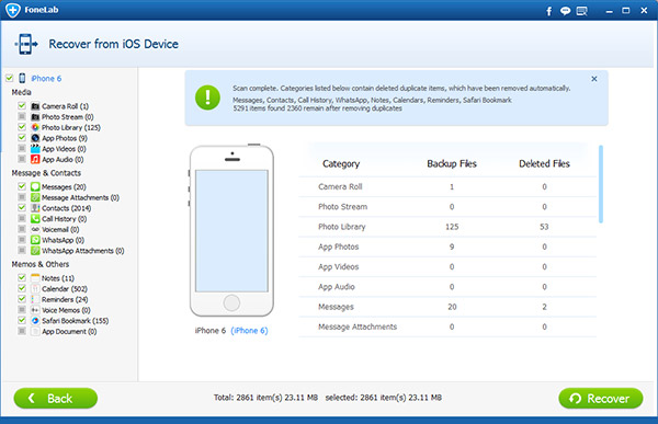 Passo 2: Quando termina la scansione del iPhone vedrai una schermata riassuntiva con tutti i dati trovati. Potrai facilmente scegliere il tipo di dati da visualizzare in anteprima, come foto, messaggi, contatti, note, cronologia delle chiamate, ecc…