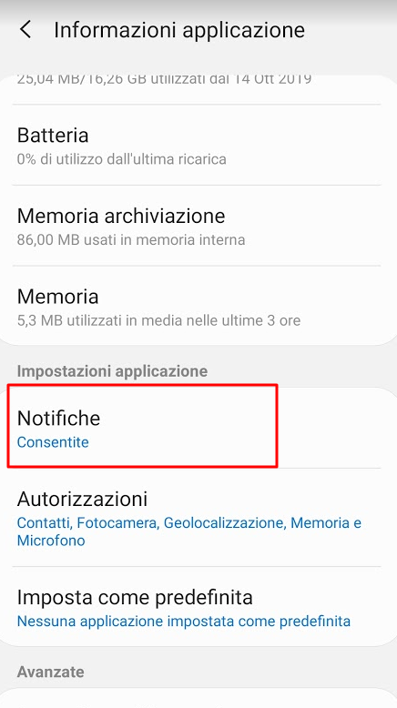 Step 3. Verifica che in corrispondenza di “Notifiche” ci sia scritto “consentite, come si vede nella figura qui sotto. In caso negativo imposta su “consentite” per ripristinare il funzionamento delle notifiche di whatsapp.