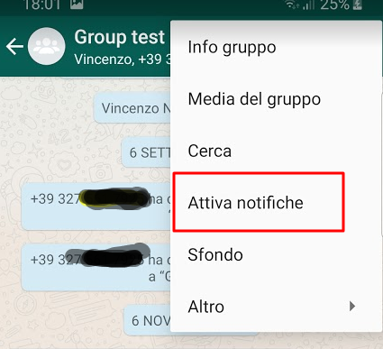 Questa opzione vale sia per gruppi che singole chat. Apri la chat individuale o di gruppo e tocca i tre punti in alto a destra. Tocca ATTIVA NOTIFICHE e sei a posto.