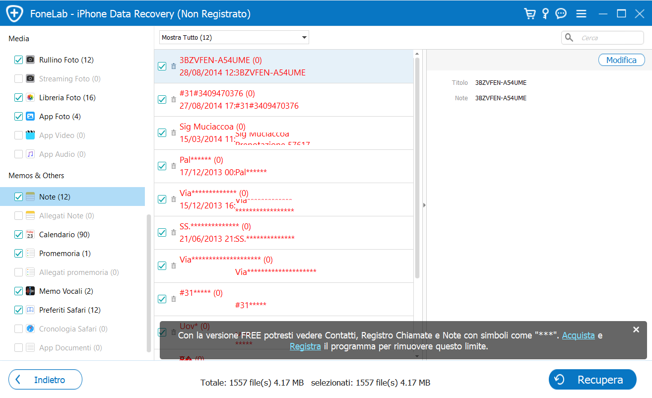 Occorre acquistare la licenza del programma per avere accesso alle note recuperate e procedere al loro salvataggio sul computer