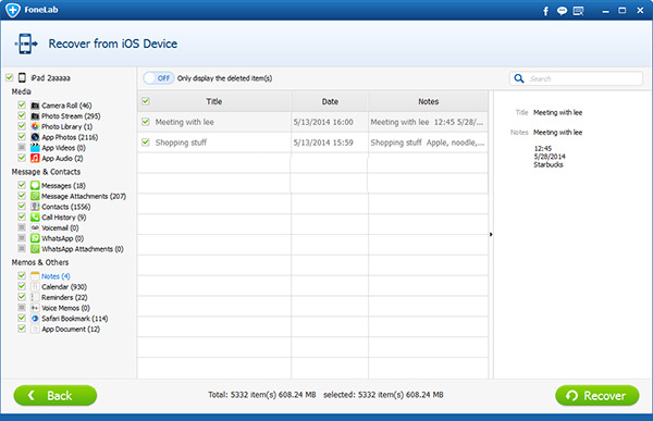 Dopo la scansione potrai controllare e vedere in anteprima le note trovate. Seleziona quelle da ripristinare e clicca su “Recover” per salvarle sul tuo PC Windows o Mac OS X.